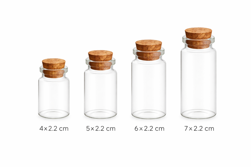 Стъклено шишенце 2.2х6 см с естествена коркова тапа – практично и елегантно решение за съхранение на подправки, билки, ароматни масла, дребни декоративни елементи и сувенири.
