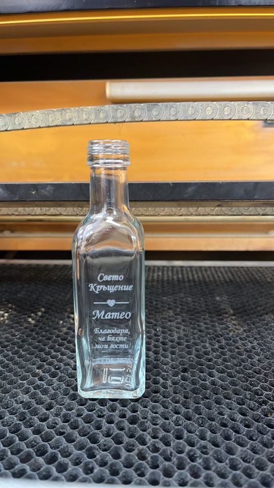 Симпатична малка бутилка с вместимост 100мл. Подходяща за подаръче за гостите на вашата сватба или кръщене! Бутилката е с квадратна форма .