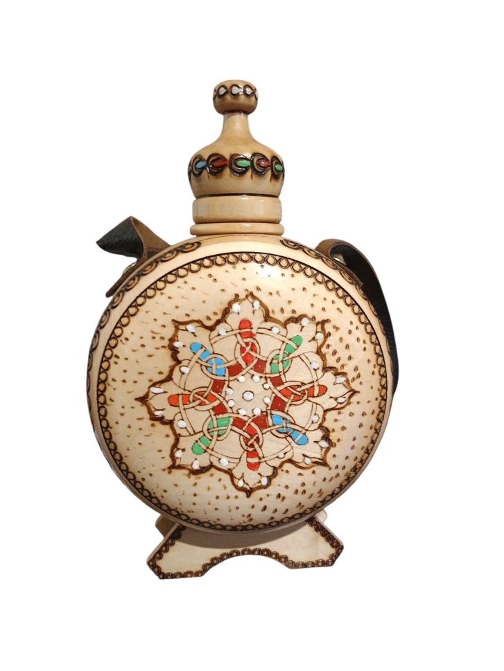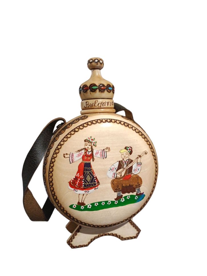 Елегантна дървена бъклица с вместимост 0.5 литра, украсена с цветна пирография – традиционно българско изкуство, което придава уникален и автентичен вид.
