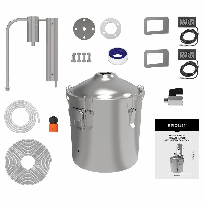 Дестилатор 30 л с конвекс (изпъкнал) капак – професионален комплект за домашно дестилиране на вода, алкохолни напитки и ароматни течности.
