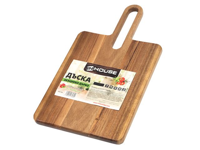 Дъска от масивно акациево дърво с размери 36×20×1.5 см – здрава и практична за рязане и сервиране на храни.