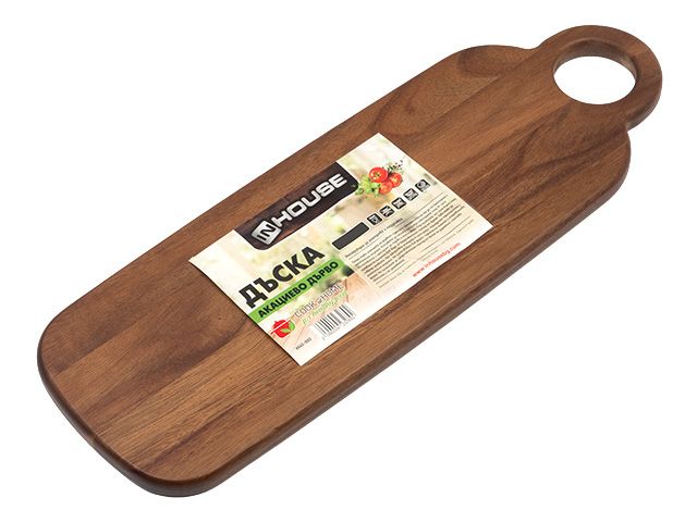Дъска от масивно акациево дърво с размери 44×15×1.6 см – здрава и елегантна за рязане и сервиране на различни храни.