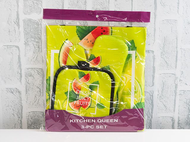 Комплектът включва ръкавица, ръкохватка и престилка с цветен плодов десен – практичен и стилен аксесоар за кухнята.