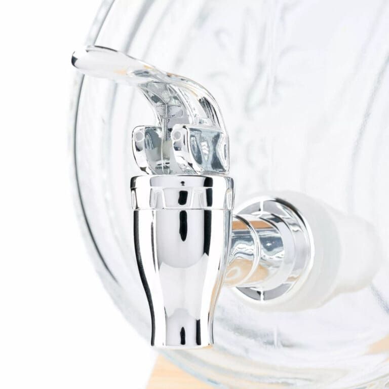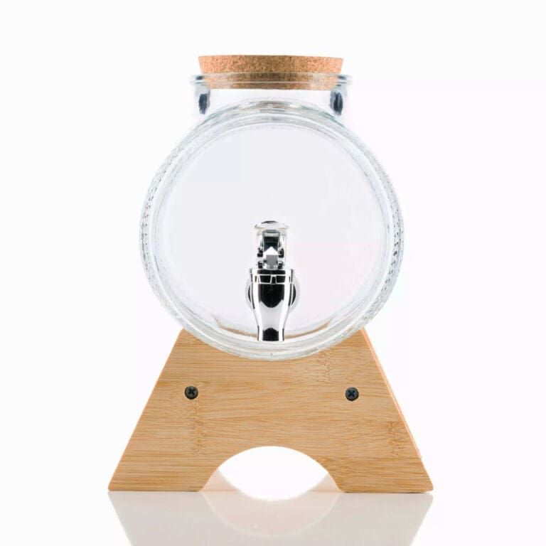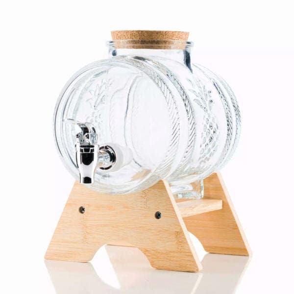 Стилно стъклено буре с вместимост 1 литър върху дървена поставка – идеално за съхранение и сервиране на ракия, вино и други напитки. Подходящо за подарък, декорация или домашен бар с автентична визия.