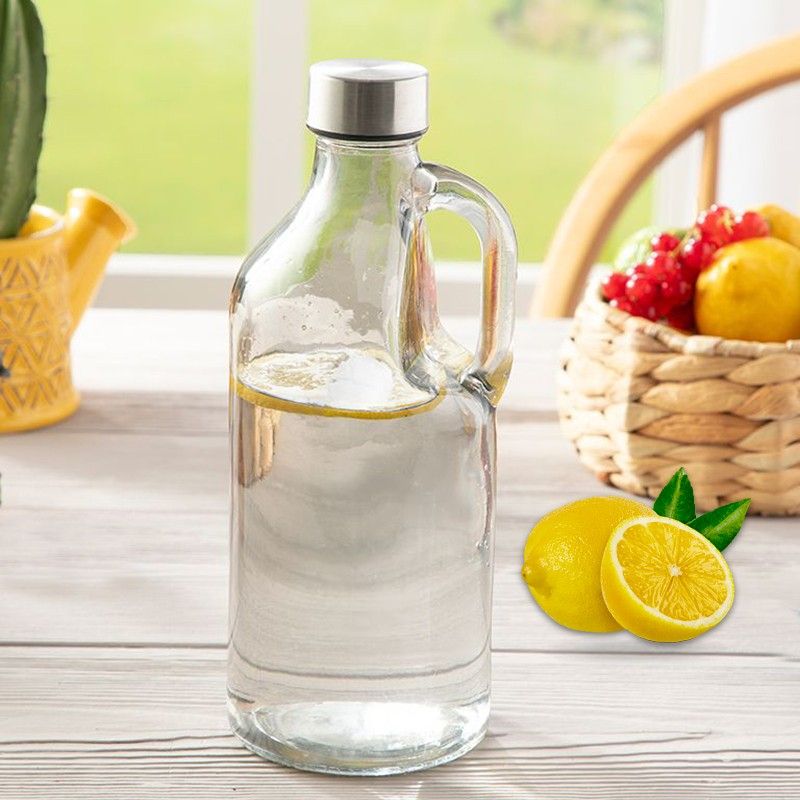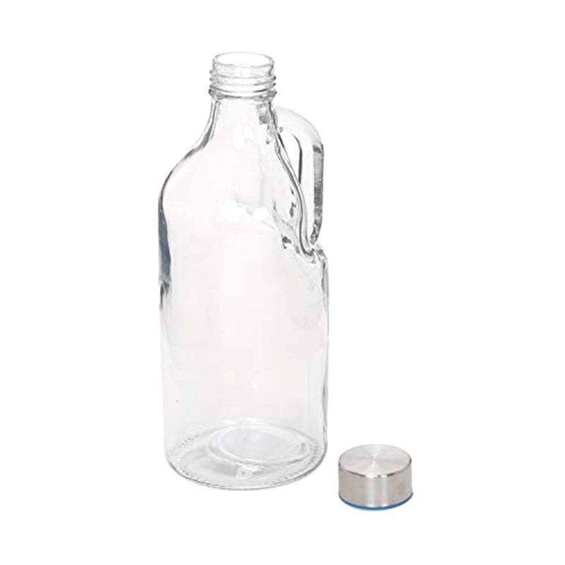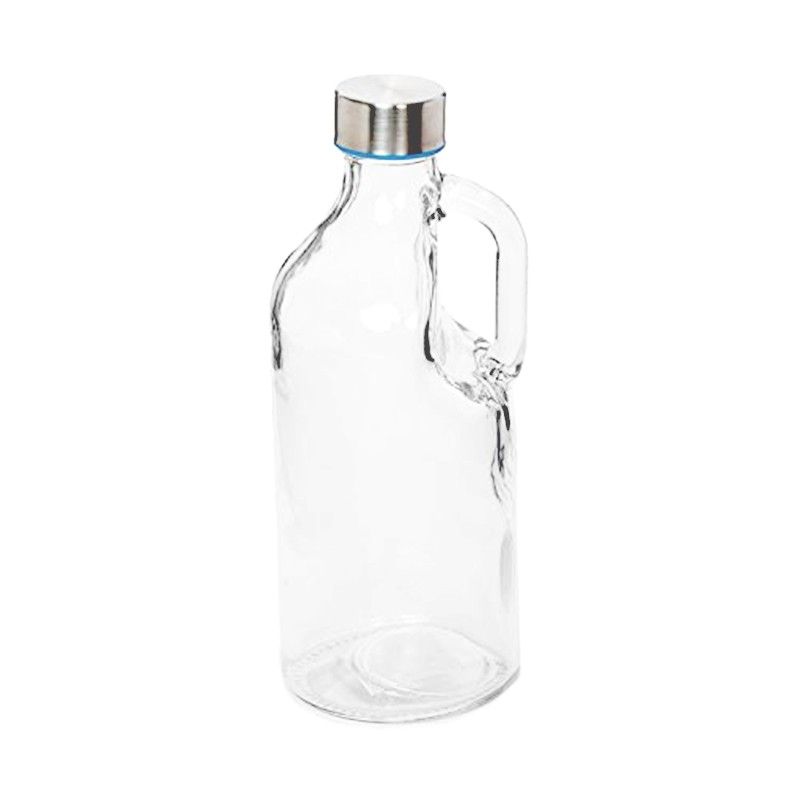 Стъклена бутилка с вместимост 1 литър, снабдена със здрава метална капачка и удобна дръжка за лесно пренасяне.
